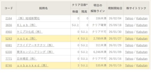 増担保規制の解除基準 : 乖離(25DMA乖離率)と信残(信用残高比率)のクリア日数の両方が5以上となることが増担保規制が解除されるために必要な条件となります。条件を満たすとほとんどのケースで解除されますが、例外的に東証の判断で解除されない事もあります。