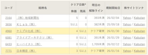 増担保規制の解除基準 : 乖離(25DMA乖離率)と信残(信用残高比率)のクリア日数の両方が5以上となることが増担保規制が解除されるために必要な条件となります。条件を満たすとほとんどのケースで解除されますが、例外的に東証の判断で解除されない事もあります。