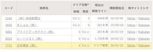 増担保規制の解除基準 : 乖離(25DMA乖離率)と信残(信用残高比率)のクリア日数の両方が5以上となることが増担保規制が解除されるために必要な条件となります。条件を満たすとほとんどのケースで解除されますが、例外的に東証の判断で解除されない事もあります。