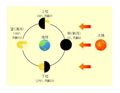 そもそも、太陽,月,地球がこの順に並んだときは,月の輝いた面は地球からは見えず新月で、この日が朔(さく)となります。